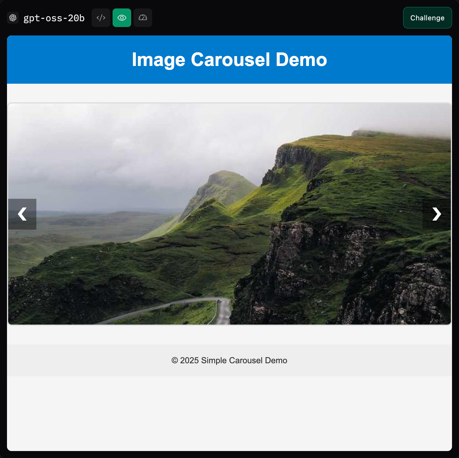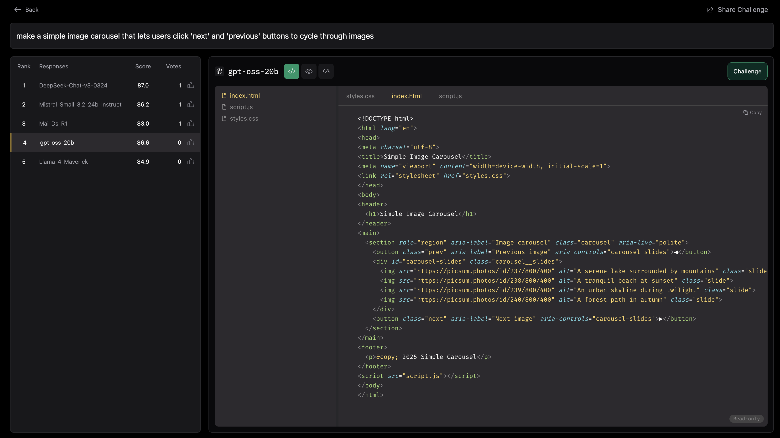 I wanted to understand what separates working code from good code. So I used VibeCodeArena.ai to pick a problem statement where different LLMs produce code for the same prompt. Upon landing on the main page of VibeCodeArena, I could see different challenges. Since I was interested in an Image carousal application, I picked the challenge with the prompt "Make a simple image carousel that lets users click 'next' and 'previous' buttons to cycle through images."
