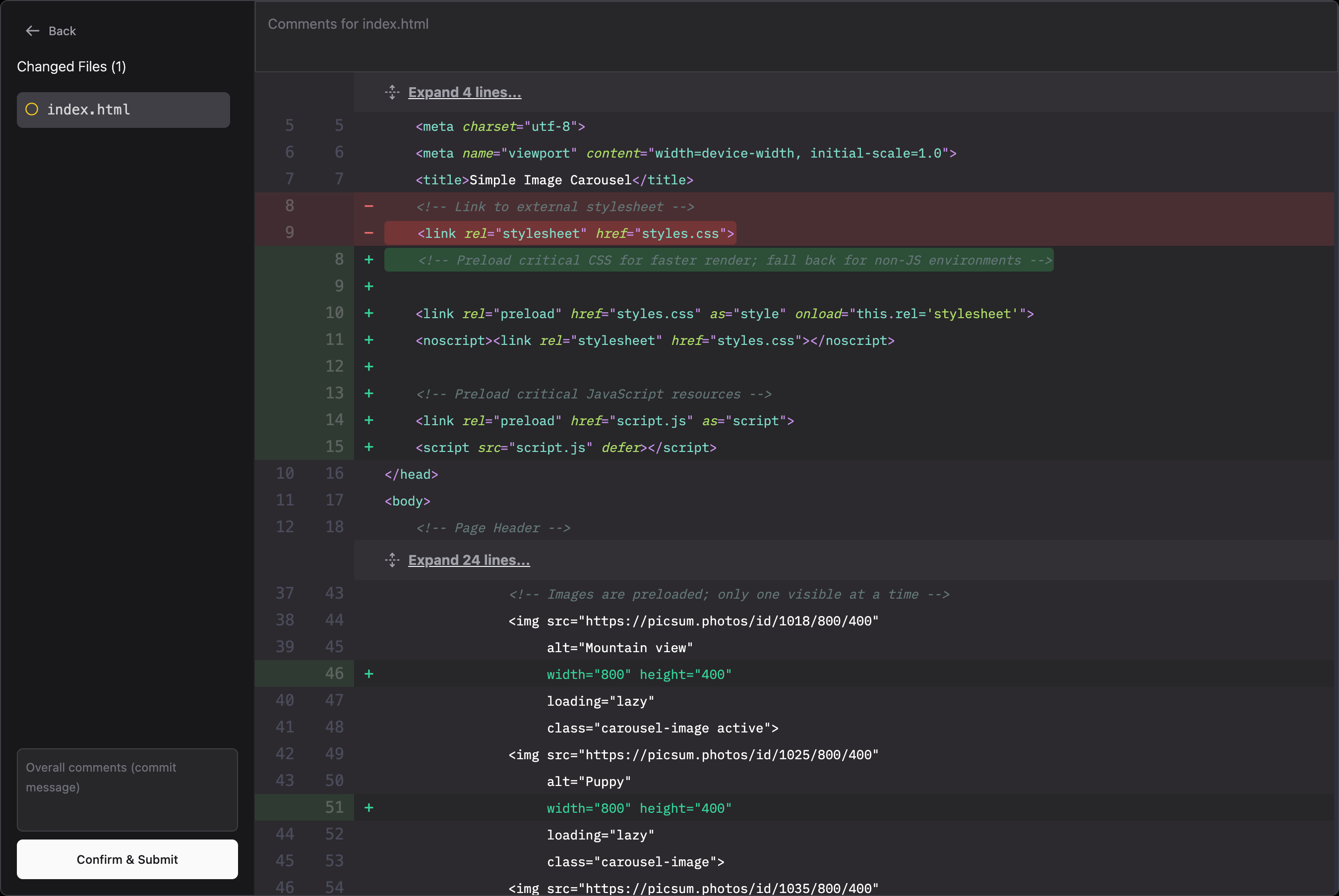 For my experiment, I decided to work on two suggestions provided by VibeCodeArena by preloading critical CSS/JS resources with <link rel="preload"> for faster rendering in index.html and by adding explicit width and height attributes to images to prevent layout shift in index.html. The code editor gave me change summary before I submitted by code for evaluation.